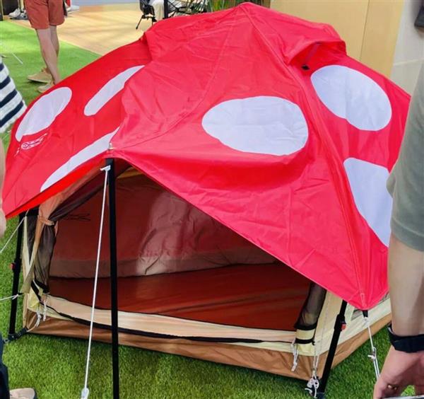 义乌市宣闻户外用品有限公司总经理朱悦来还推出了蘑菇帐篷。一片草坪上,一个个帐篷搭在那里,无人机拉起来就像这座山上的一片自然长大的蘑菇。