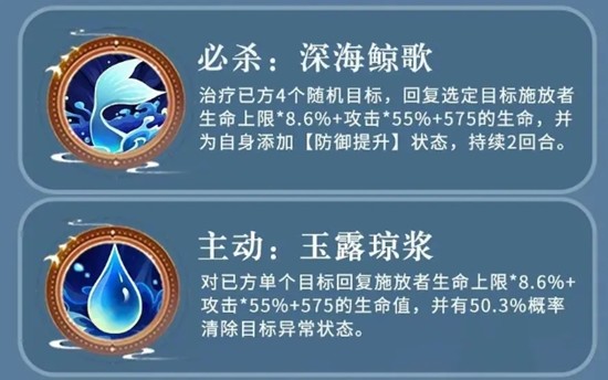 小乔在三国志异闻录中的定位非常明确,属于团队中的奶妈角色,主要职责是维持队友的生命值状态,提升整体生存能力。她的必杀技名为深海鲸戈,能够为己方随机四名队友恢复生命值,恢复量基于小乔自身生命上限的8.6%、攻击力的55%以及固定575点数值叠加而成,综合治疗量相当可观。释放技能后,小乔自身还会获得持续两个回合的防御提升,增强了她在战场上的存活能力。