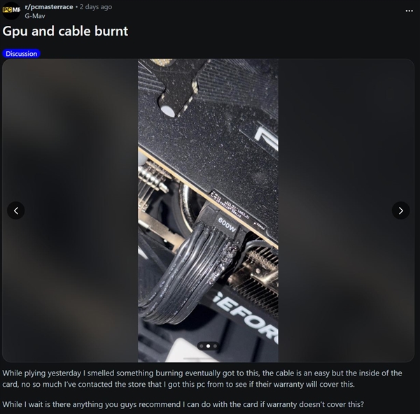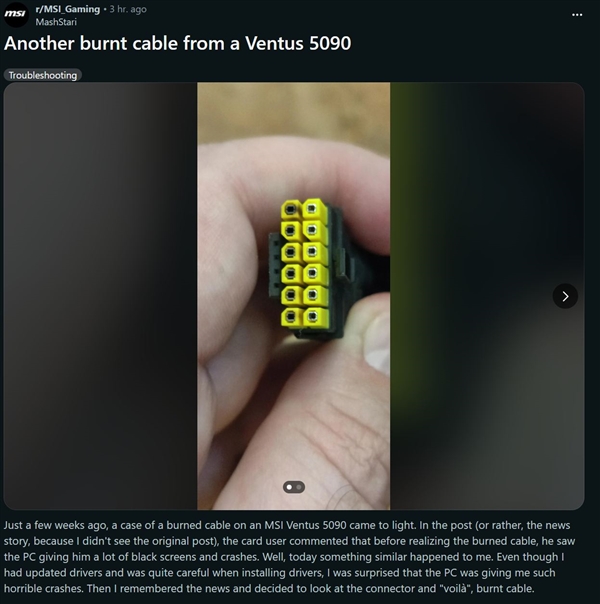 过去48个小时内,仅仅是在Reddit论坛上,就有四位网友发帖称自己的RTX 5090 16针供电接口/电源线烧毁了。
