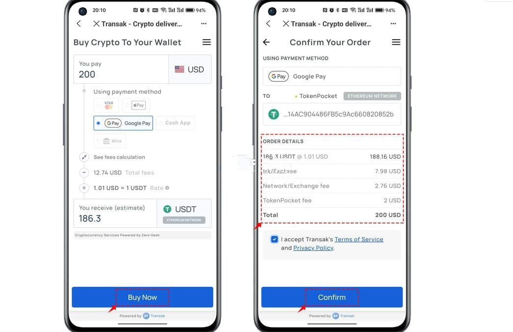 5、界面会自动跳转到服务商的专属页面,默认选择【Google Pay】,点击【Buy Now】会要求填入邮箱地址,并通过邮箱发送一个验证码进行登录。登录后,如果是首次使用需要进行KYC认证,认证完成后即可进入到兑换的详情界面,点击【Confirm】进入到最终的支付界面。