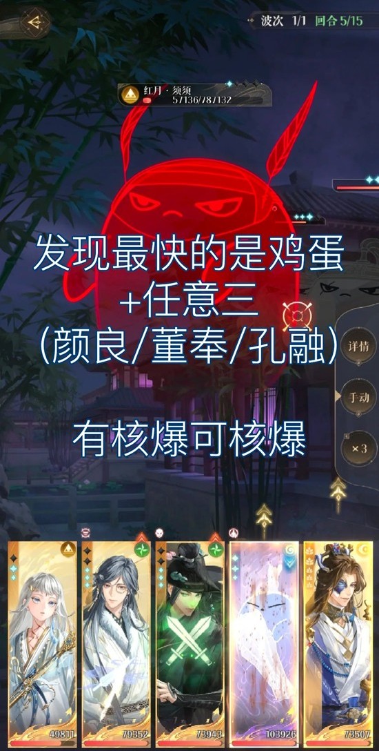 第一回合打张鲛,第二回合打张鲛,普攻1-2次小兵,第三回合击退 3 小兵,第四回合击退 2,第五回合击退 0,普攻1-2次小兵