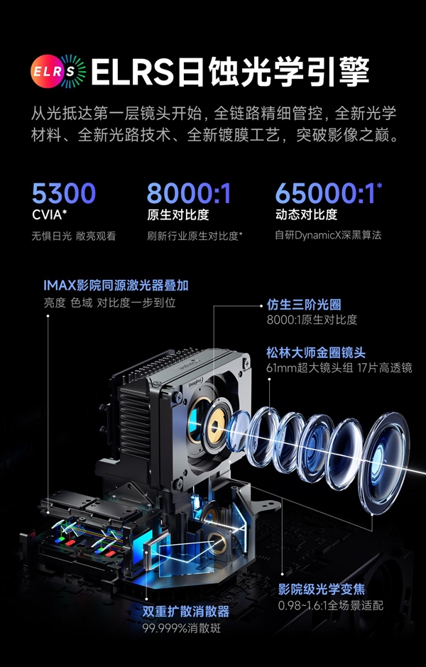 作为针对家用场景的专属光学方案,ELRS 日蚀光学引擎核心目标是提升光线利用率、减少光损: