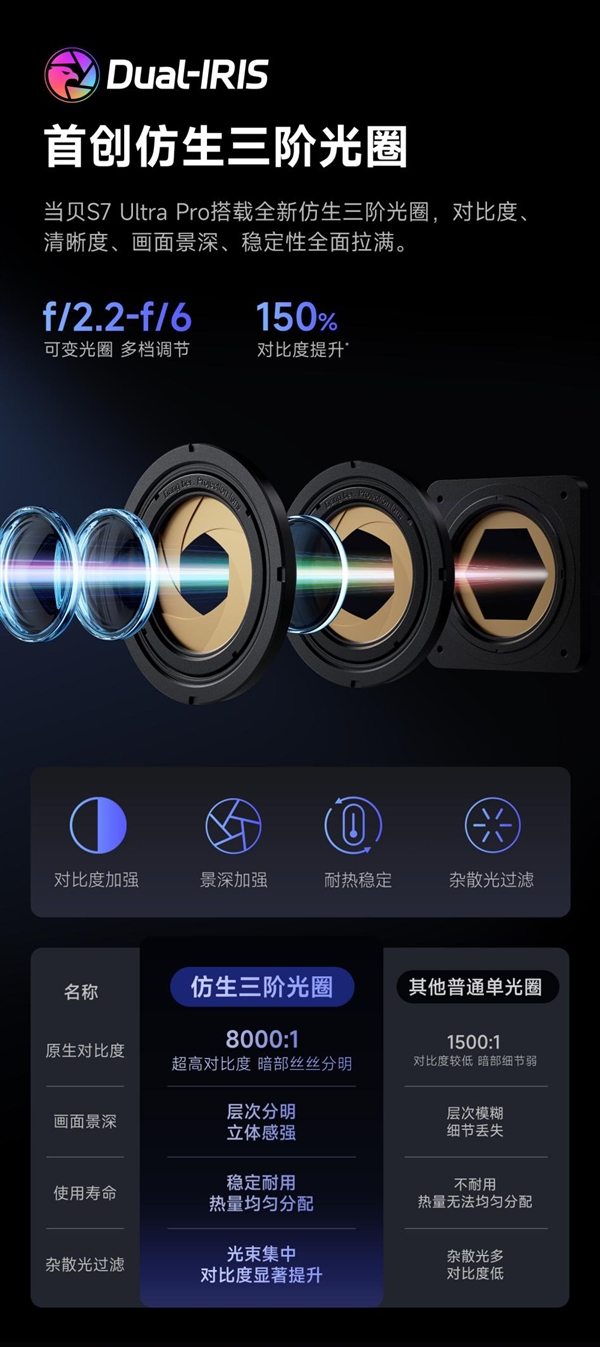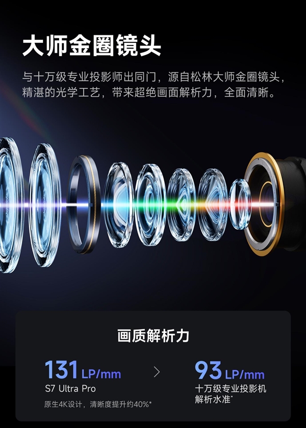 当贝 S7Ultra Pro 搭载 17 片高定镜片组成的松林大师金圈镜头,61mm 超大口径配合原生 4K 设计,解析度达 131 LP/mm(十万元级专业投影配置),可最大程度减少光线折射损耗,让画面边缘更锐利、细节更清晰。而真正让其画质脱颖而出的,是当贝自研的ELRS 日蚀光学引擎、偏振控光技术,以及行业首创的8 重消散斑模组—— 三项技术从光线处理到画面呈现全链路发力,解决家用投影光损、杂光、散斑三大核心痛点。