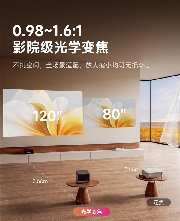 支持 0.98-1.6:1 超级无损光学变焦(同价位多为 1.2-1.5:1),不同距离无需移机即可调画面尺寸,且无画质损耗: