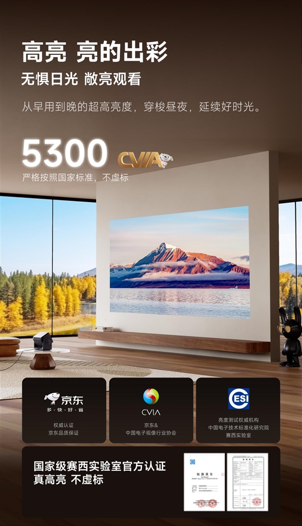 5300 CVIA 亮度靠 ELRS 引擎(高透光率减光损)与偏振控光(滤环境光)加持,500lux 环境光(客厅开 4 盏漫射灯)下画面仍通透,无需拉窗帘,实现 “白天观影自由”。