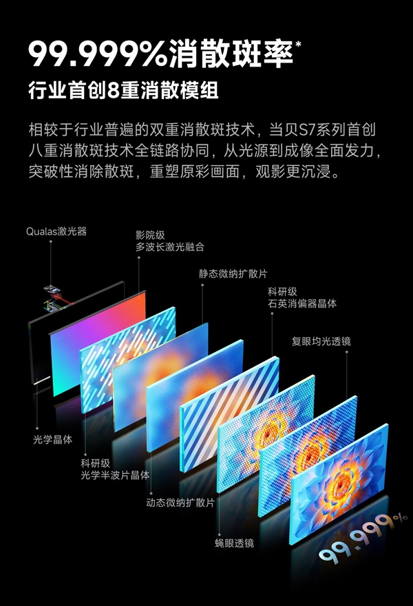 激光投影普遍存在的散斑(光线干涉导致颗粒感),被 8 重消散斑模组通过 “物理 + 光学” 双重方案解决: