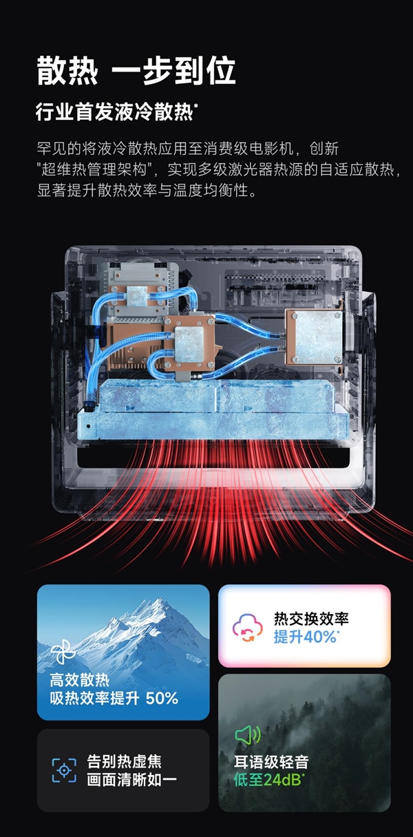 针对激光投影高功率光源的散热需求,当贝 S7Ultra Pro 搭载行业首发的全链路液冷散热系统,解决传统风冷 “噪音大、散热不均” 问题: