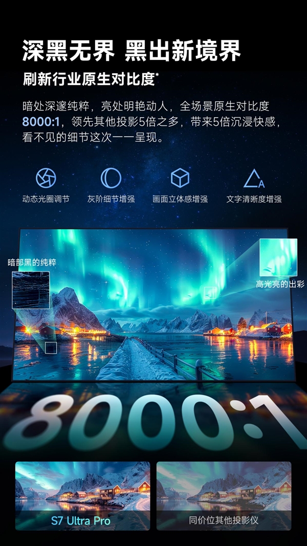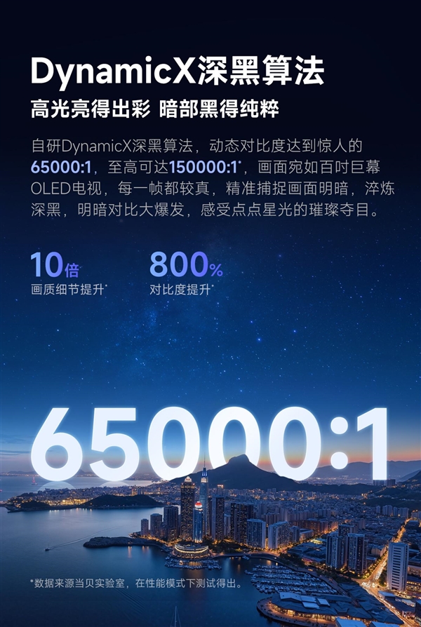 仿生三阶光圈(f/2.2-f/6 可调) 与 ELRS 引擎、偏振控光协同:暗场景收缩光圈减进光,配合 DynamicX 深黑算法强化黑场;引擎聚焦暗部光线,偏振控光滤暗部杂光,动态对比度达 65000:1(原生对比度 8000:1)。