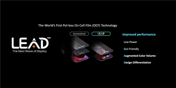 此外,LEAD? 通过替换偏光片,有助于减少塑料降低碳排放,同时令屏幕更薄更轻,支持灵活纤薄设计。三星显示计划通过品牌“LEAD”向市场推广其尖端技术,并积极开展营销活动,该品牌体现了这项技术低功耗(Low Power Consumption)、低碳环保(Eco-Friendly)、扩大色域(Augmented Color Volume)以及差异化设计(Designed Differentiation)的四大核心优势。