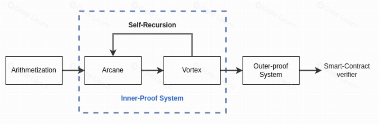 Arcane 和 Vortex 建立一个简洁的证明系统,zk-EVM算术由Arcane编译,其作用是将zk-EVM算术转化为多项式-IOP,使用 Vortex 将多项式 IOP 实例化为具体的证明系统,Vortex 配备了自递归机制,允许迭代压缩证明。