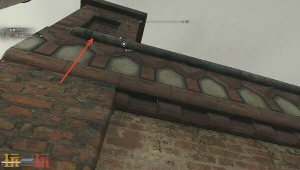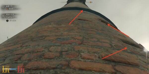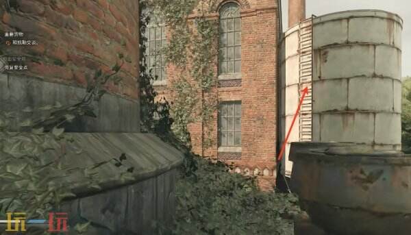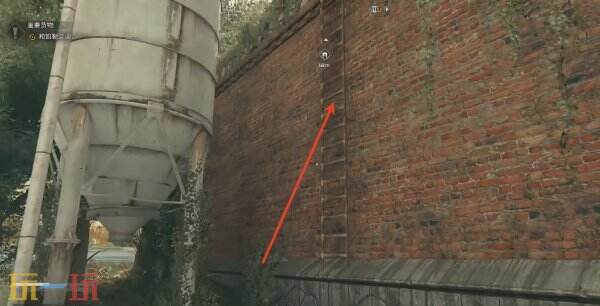 面朝烟囱的位置,从墙上的梯子往上爬。