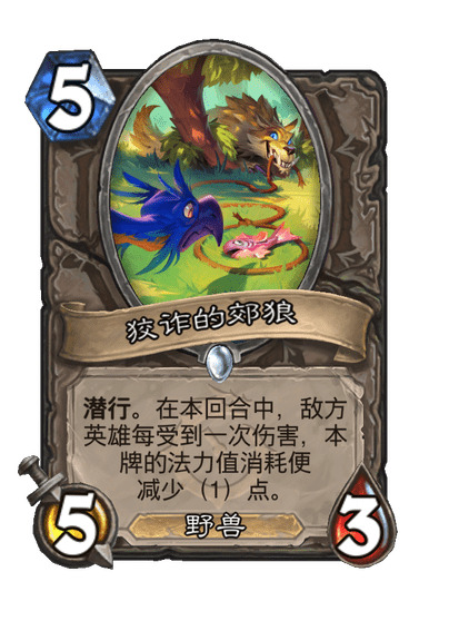 潜行。在本回合中,敌方英雄每受到一次伤害,本牌的法力值消耗便减少(1)点。