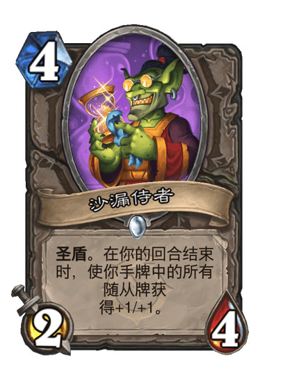 圣盾。在你的回合结束时,使你手牌中的所有随从牌获得+1/+1。
