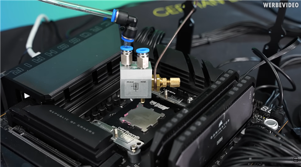 为了测试喷雾冷却的效果,Der8auer搭建了一个临时的冷却系统,该系统由一颗Ryzen 7 9800X3D CPU和一个经过改装的定制水冷系统组成。