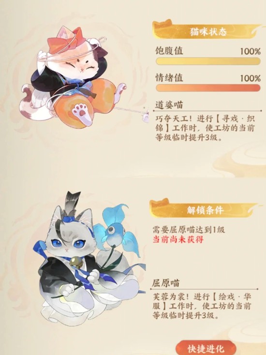 4.猫猫不工作也消耗饱食度,记得要给小猫做饭,空闲时心情提升。