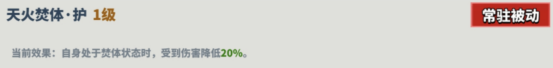 描述:自身处于焚体状态时,受到伤害降低20%。