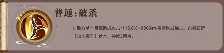 对敌方单个目标造成攻击*115.6%+696的伤害若触发暴击,自身获得【攻击提升】状态,持续3回合。