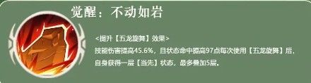 技能伤害提高45.6%,且状态命中提高97点每次使用【五龙旋舞】后,自身获得一层【当先】状态,最多叠加5层。
