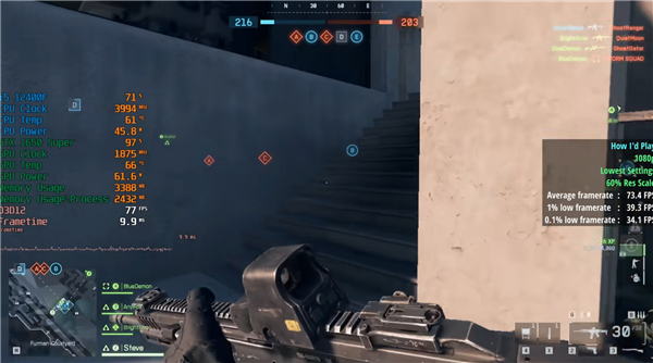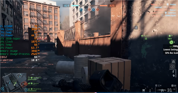 搭配i5-12400F处理器,游戏中二者的显存毫无意外都直接爆了,但是在1080p、最低画质下仍然都能跑出50-60FPS,基本流畅。