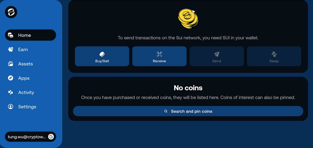 登入后会有一个像这样的界面,在DeFi 协议连接钱包时若选择Slush,点击就会连往这里,基本操作逻辑和一般钱包差不多,特色在于可社交登入相当方便& 提供网页版。