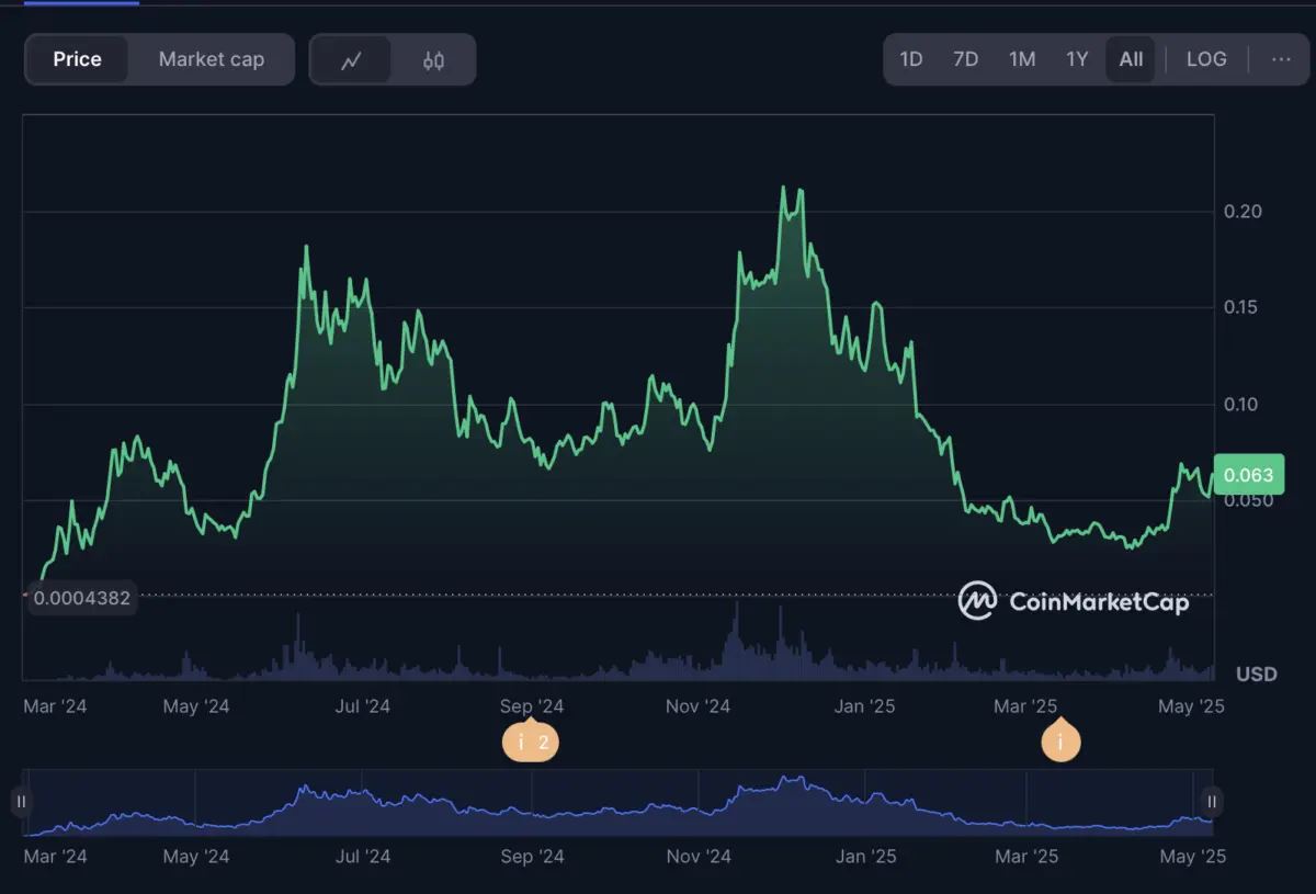 Brett 于 2023 年 7 月推出,价格约为 0.0001 美元,由于参与度不断提高,到 8 月已升至 0.0005 美元。“男孩俱乐部”相关的品牌的推动下,它在 9 月份攀升至 0.0015 美元,10 月份攀升至 0.005 美元。到 11 月中旬,其价格达到 0.01 美元,年底在 0.008 美元至 0.012 美元之间波动。Brett 于 2024 年 3 月跌至 0.01945 美元的低点,但随着生态系统的发展,到 5 月反弹至约 0.05 美元。 6 月触及 0.1939 美元的高点,7 月至 10 月稳定在 0.10 美元至 0.15 美元之间。 11 月,Brett 交易价格高达 0.1910 美元; 12 月,目前处于 0.1606 美元至 0.1708 美元的范围内。2025 年 1 月,Brett 的交易价格在 0.14 美元至 0.15 美元之间但是,布雷特(Brett)在一月份的收盘价为0.825美元。截至2025年2月,布雷特的交易价格为0.821美元。布雷特价值在3月下降到$ 0.030范围时进一步下降。截至4月,布雷特(Brett)下跌,目前的交易价格在0.025美元至0.026美元之间。布雷特(Brett)以0.06美元的价格结束。 5月初,布雷特·普莱斯(Brett Price)的交易价格在0.061美元至0.063美元之间。