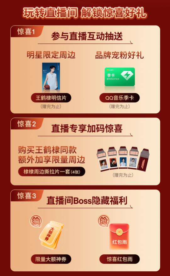 直播间更将限时开启大额神券抽奖、惊喜红包雨等多重隐藏福利。此外,用户还可参与“王鹤棣集卡”活动,有机会赢取万元红包!多项福利轮番上阵,全程惊喜持续放送!