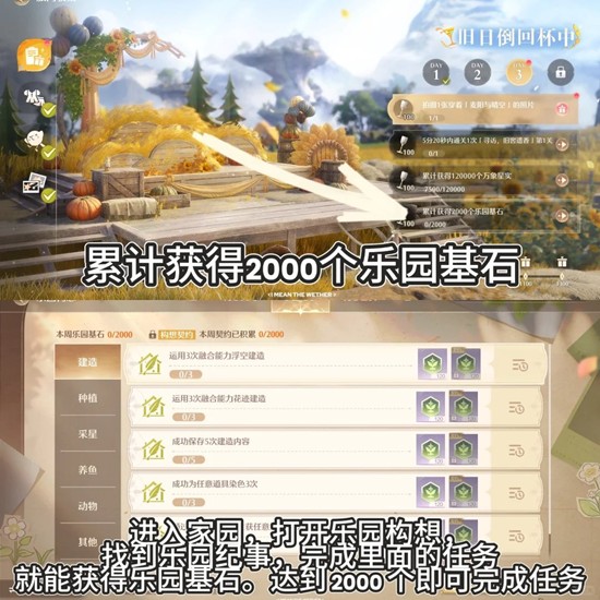 进入家园,打开乐园构想,找到乐园纪事,完成里面的任务就能获得乐园基石,累计达到2000个即可完成任务