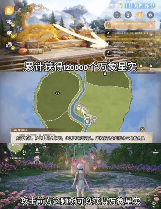 打开地图,找到自己的家园,传送到家园码头,跟随箭头走到蓝色三角指向处,攻击前方这颗树就可以获得万象星实,每周可以商城可以领取一万万象星实