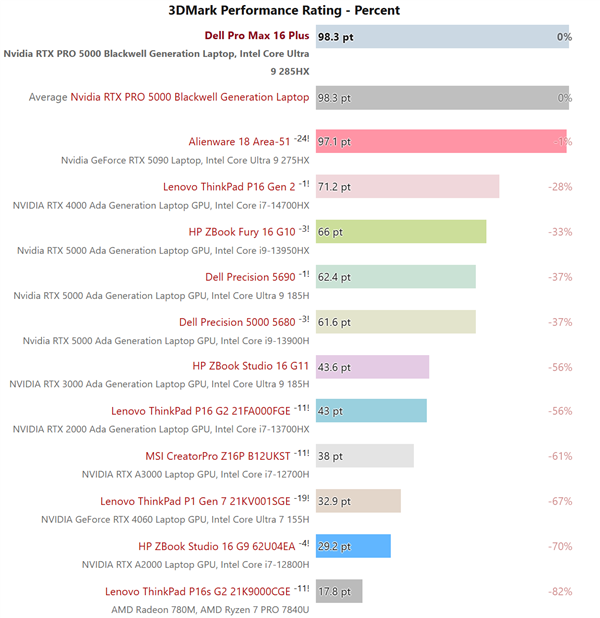 测试显示,它的3DMark相对综合成绩为98.3分,只是略低于外星人Area-51 m18中的RTX 5090,差距大约1%。