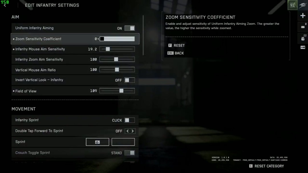 玩家需要先关闭“统一步兵瞄准(Uniform Infantry Aiming)”,然后向下滚动找到“缩放灵敏度平滑(Zoom Sensitivity Smoothing)”,也把这个关了,然后再返回去重新开启“统一步兵瞄准”,并把系数(coefficient)设为0。