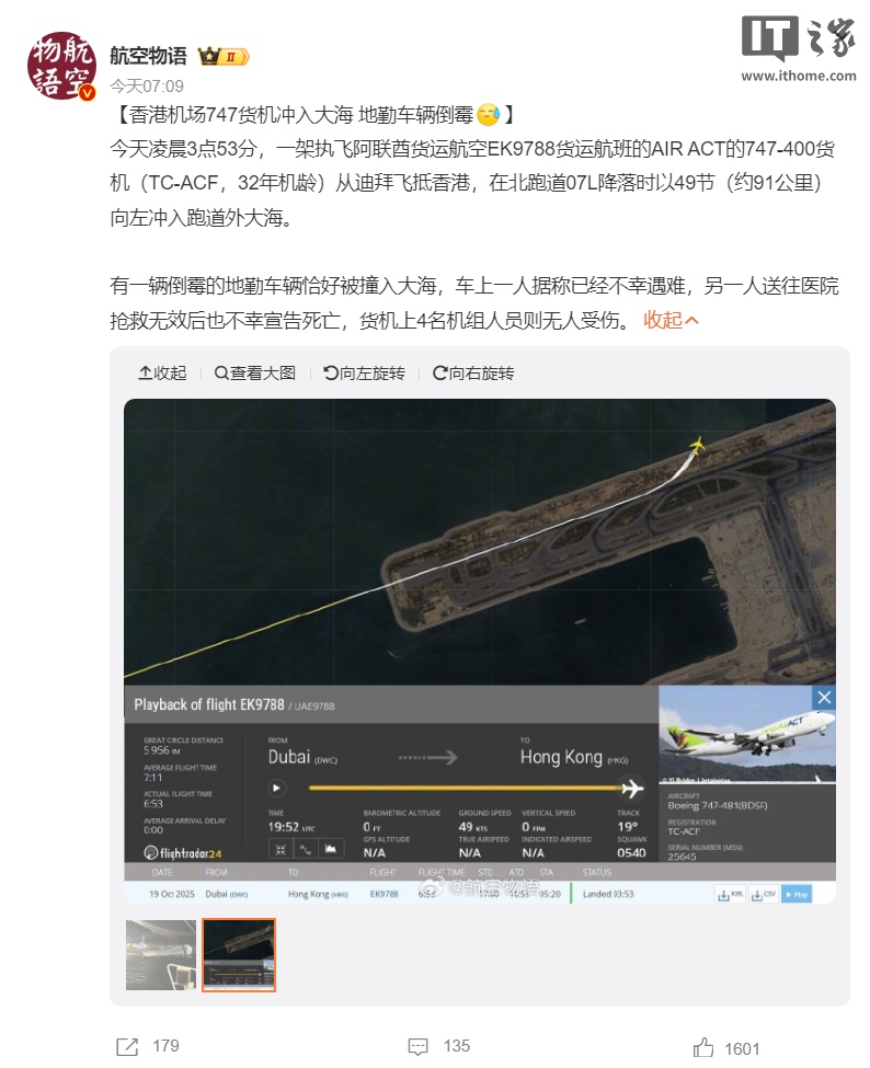 据第一财经报道,阿联酋航空确认,10 月 20 日在香港降落时受损的 EK9788 航班系湿租自 Act Airlines 并由其运营的货机。该飞机为注册号 TC-ACF 的波音 747-400 型货机,机上机组人员已确认安全,且未载有货物。