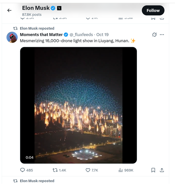 浏阳无人机烟花秀破世界记录 马斯克转发相关视频