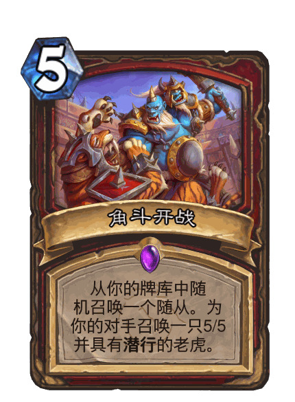 从你的牌库中随机召唤一个随从。为你的对手召唤一只5/5并具有潜行的老虎。