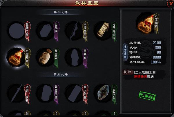 另一个“武侠特色”是“武林至宝”系统,就像那种江湖上赫赫有名,人人都想寻找的神兵利器或有奇妙能力的宝物一样,《千击武侠沉默》中也有这样神秘的存在,同样通过特殊的剧情任务、刷怪或部分充值活动来获取,它不但能给玩家带来大量属性加成,还有一些在指定大陆上能够激发的特殊效果。