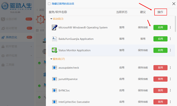 2、点击进入之后,便可以看到目前系统的禁用项列表,只需要点击操作步骤这栏,选择“启用”或“禁用”即可。