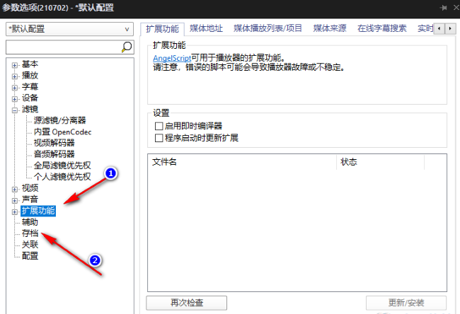 2、在打开的窗口界面中,点击左侧栏中的"扩展功能"选项,再点击其中的"存档"。