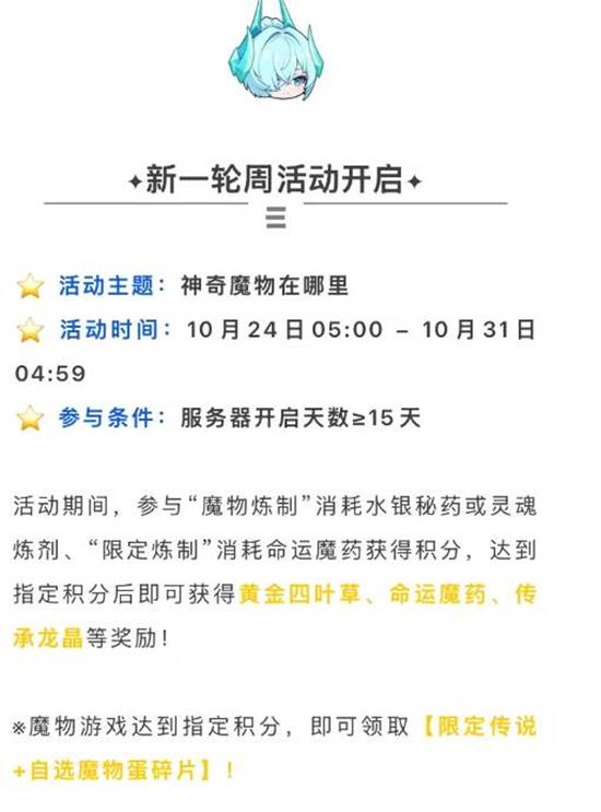 新一轮周活动「神奇魔物在哪里」将于10月24日05:00至10月31日04:59开启,参与条件为服务器开启天数≥15天。活动期间,玩家可以通过参与“魔物炼制”和“限定炼制”活动获得积分,达到指定积分后即可获得丰厚奖励。