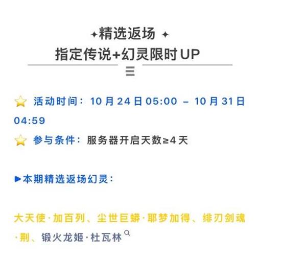 精选返场活动将于10月24日05:00至10月31日04:59开启,参与条件为服务器开启天数≥4天。本期精选返场幻灵包括大天使·加百列、尘世巨蟒·耶梦加得、绯刃剑魂等。