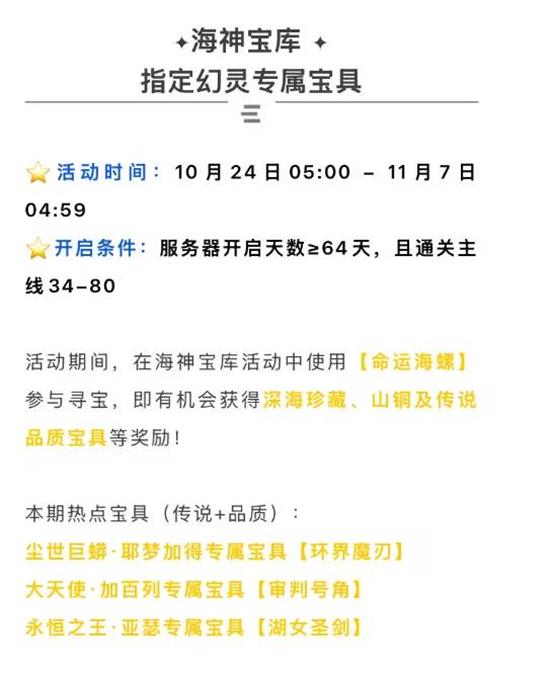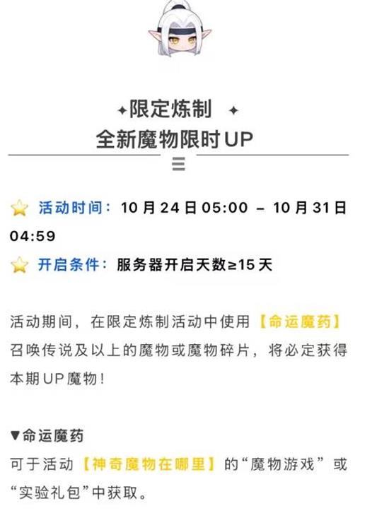 在限定炼制活动中,玩家使用【命运魔药】召唤传说及以上的魔物或魔物碎片,将必定获得本期UP魔物。活动时间为10月24日05:00至10月31日04:59,服务器开启天数需≥15天。