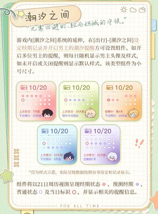 游戏内[潮汐之间]系统的延伸,在[出行]-[潮汐之间]设定经期记录并开启男主的潮汐提醒方向设置组件。如开启多位男主的提醒,则每日随机显示男主头像及样式,如未开启或关闭提醒则显示默认样式。该类型组件为小号尺寸。
