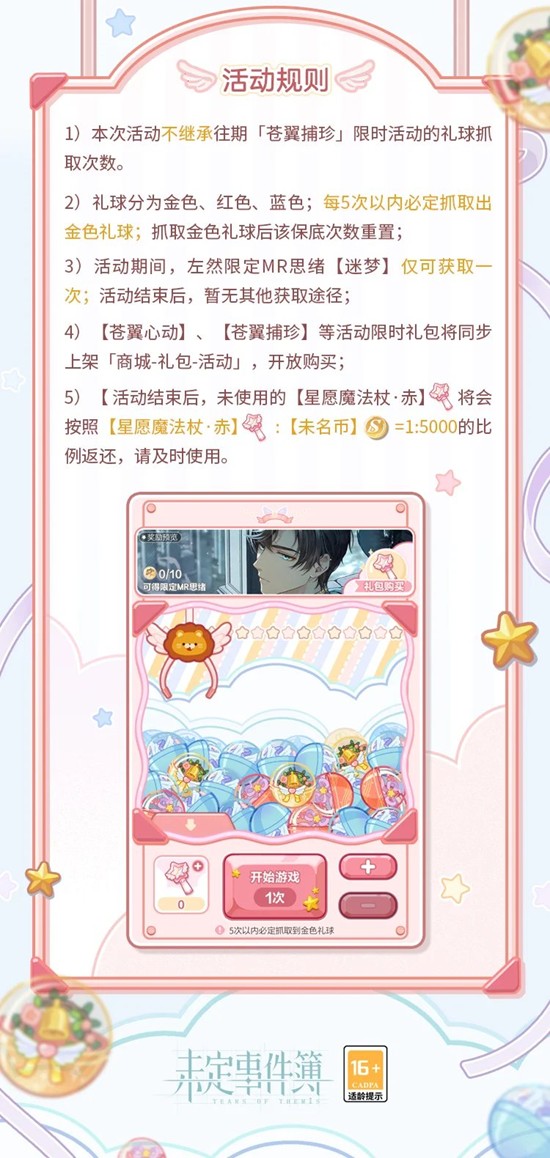 2)礼球分为金色、红色、蓝色;每5次以内必定抓取出金色礼球;抓取金色礼球后该保底次数重置;3)活动期间,左然限定MR思绪【迷梦】仅可获取一次;活动结束后,暂无其他获取途径