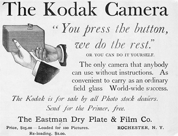 后来这老哥火速创建了柯达公司,并推出了 “ 柯达一号 ” 盒式相机,它预装了能拍 100 张照片的胶卷,拍完不用自己洗,直接把相机打包寄回柯达就行,等于是对摄影行业来了波降维打击。