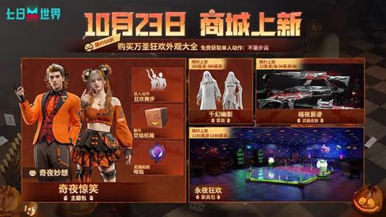 从10月23日至11月2日,《七日世界》将推出万圣狂欢主题外观,限时售卖。为了庆祝万圣节的到来,除了万圣狂欢主题外观,还有惊喜特惠同步来袭。更有万圣大全礼包限时折扣,一键购买,让你轻松获取所有节日装扮,享受超值优惠。