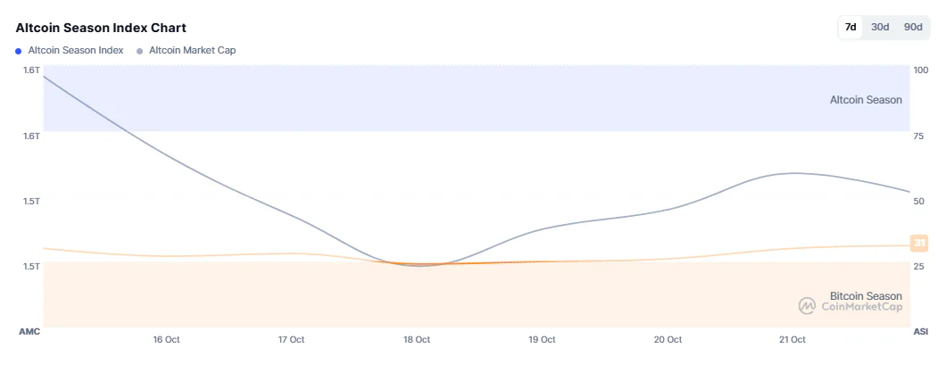 “>市值闪烁突破信号根据 CoinMarketCap 的山寨币季节指数,该指标目前为 31,较昨日的 26 和上周的 35 逐渐上升。该指数仍在比特币的 主导区间,但其稳步攀升暗示市场情绪可能正在转变。从历史上看,75 以上的读数表明山寨币的表现优于比特币,标志着交易员们所称的“山寨币季”的开始。