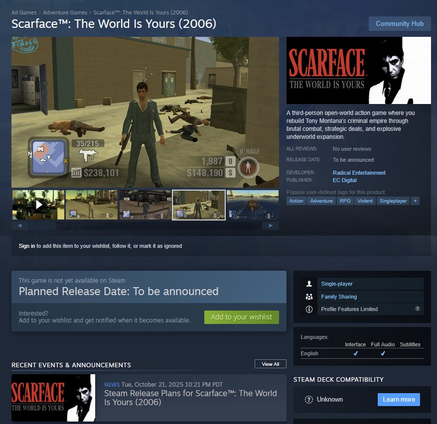 时间:2025-10-23 | 作者: | 阅读:0近日,基于1983年电影《疤面煞星》改编的2006年经典游戏《疤面煞星:掌握世界》在Steam和Epic游戏商店的重新发行计划遭遇了一系列意外,导致发行过程混乱,最终被暂时下架。