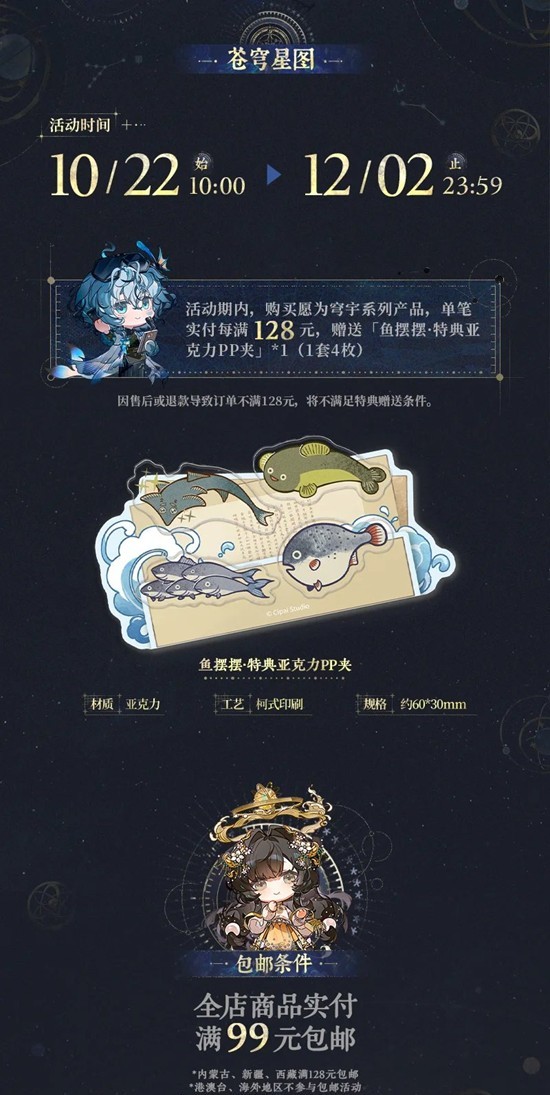 ③. 预售期间购买“愿为穹宇”系列产品,单笔实付每满128元,赠送“鱼摆摆·特典亚克力PP夹(1套4枚)”*1。
