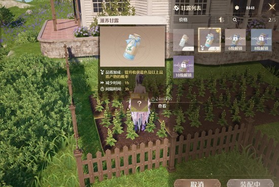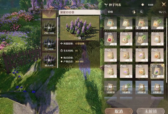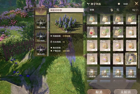 在种植能力达到四级后,解锁玲玲草跟滋养甘露,玲玲草价格二百,生长时间一小时,滋养甘露价格一百,减速一小时,白色收支持平,只要刷到蓝色跟紫色就赚了