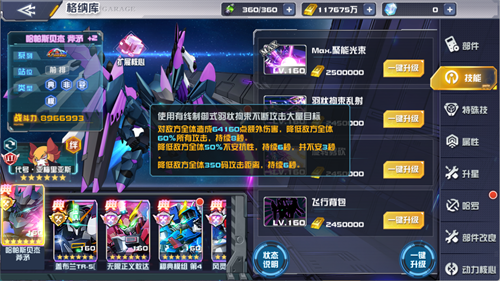 首先是其必杀技——【聚能光束】,在满级状态下,这一技能将对敌方全体造成高达10万点以上的伤害,并且附带翼斩效果。被翼斩的目标将无法行动且暴击以及所有攻击降低50%,每秒还会损失部分能量,同时每秒受到100%哈帕斯贝杰斧矛当前格斗攻击的无视所有防御伤害,持续3秒。这一强大的必杀技,不仅能够在瞬间给予敌方全体沉重打击,还能通过控制效果有效限制敌方的输出,为我方创造绝佳的进攻机会。