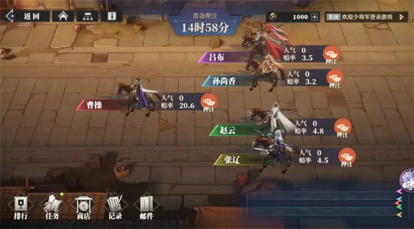① 本活动为押注竞猜玩法,每日05:00-20:00为准备期,20:00-20:15为押注期,少将军可选择押注「曹操」或「1–2名」追击武将,不可重复押注双方,并且5名武将每场比赛将不同的赔率,还请谨慎押注。