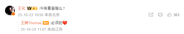 小米公关部总经理王化在评论区现身,问王腾今晚是否看直播,王腾回应称:“必须的”。